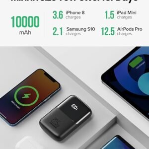 [Power for Days] The capacity of 10000mAh is stored in the mini body, providing juice to charge iPhone 8 3.6 times, Samsung S10 2.1 times, iPad Mini 1.5 times, and AirPods pro 12.5 times, etc.